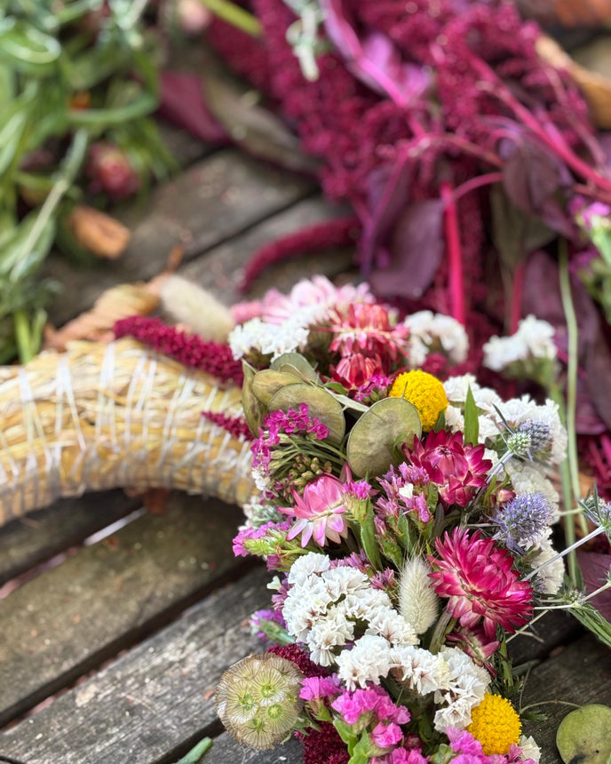 Mit den Händen arbeiten, kreativ sein und etwas schaffen, das bleibt: In diesem Workshop gestaltest du deinen eigenen Kranz aus biologisch angebauten, natürlich getrockneten Blumen vom Siebenhof.